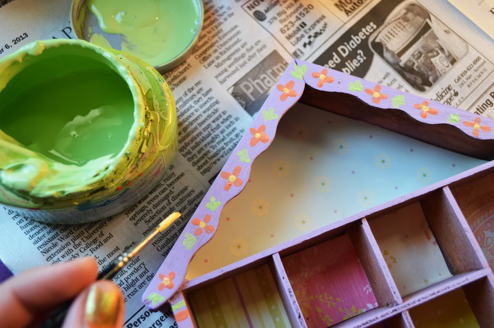 This is a pretty simple remake. I chose to paint it light purple with spray paint and then my mom gave me the idea of putting little "wallpaper" in the backs of each little room so I used scrap book paper for that. I didn't glue it in I just made it fit snug. Then I added some painted details and that was it!